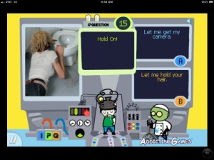 We opened Ingenious Personality Quiz, which shows you about 20 screens in succession with photos and asks “What would you do” or has you choose between two options. As we were playing, some things started popping up that were really crude…..and then the one in the picture above popped up with the drunk girl on the floor and the player being asked to choose between one of two actions; “Let me grab a camera” or “Let me hold your hair”. “Arrag! Oh my GOSH! What is this game!?!?” I screeched. “What? What’s wrong?” my daughter asked – she didn’t understand the photo (thank goodness!) We kept playing, pretty much because I wanted to know what “awful thing” was next and trusting it wouldn’t be too bad because it was a Nickelodeon App……
