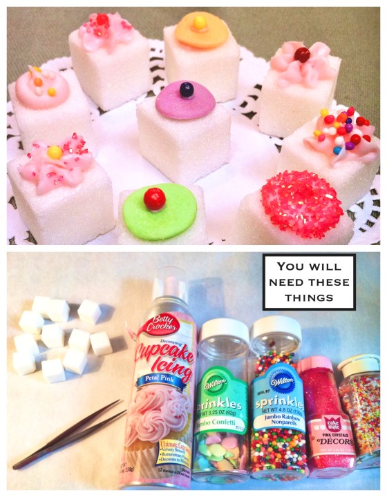 - Decorated Sugar Cube ingredients: Canned spray icing, sprinkles, sugar cubes