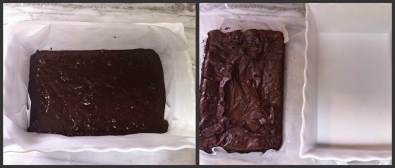 2. Line your brownie pan with two rectangles of parchment paper (make diagonal cuts on the corners to allow the paper to fold in on itself when you pour in the batter). Bake and lift out the brownies — you do not even have to wash the pan!  Yay!