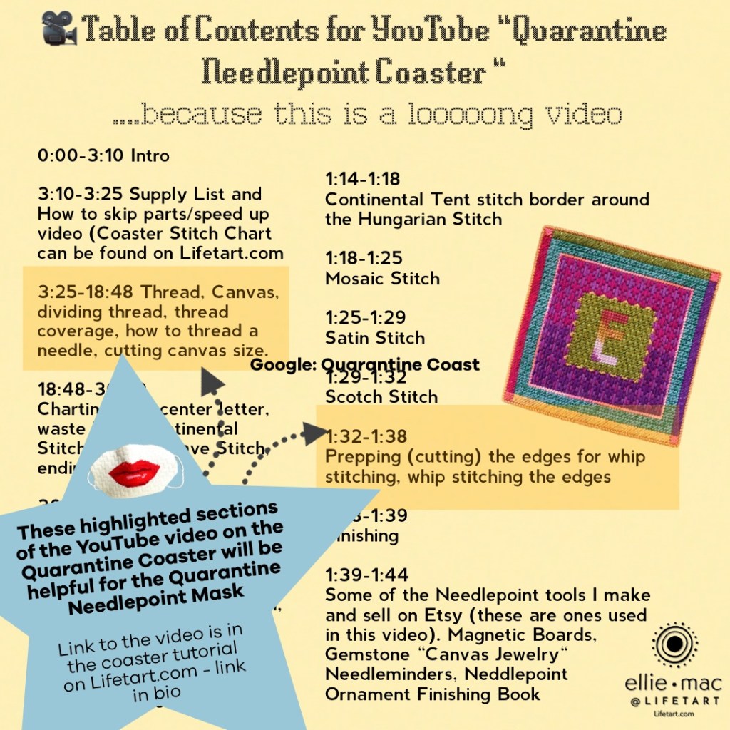 The photos below are the companion “textbook” for the video on YouTube. Be sure to watch the video so that these photos will make sense to you! I have included a “Table of Contents” – the video is 1hr 45 min so I thought it really needed a table of contents! This video covers every stitch step-by-step with all sorts of info about thread, stitches, etc. If you are a beginner, this may be of interest to you…it is intended as a quick sampler to learn all sorts of stitches and end up with a sweet little self finishing coaster. The Stitch Charts below are listed in the order they are stitched on the coaster and the order in which they appear in the video. The center colored bar that runs through the middle of the charts refers to the color of that stitch on the Master Chart.