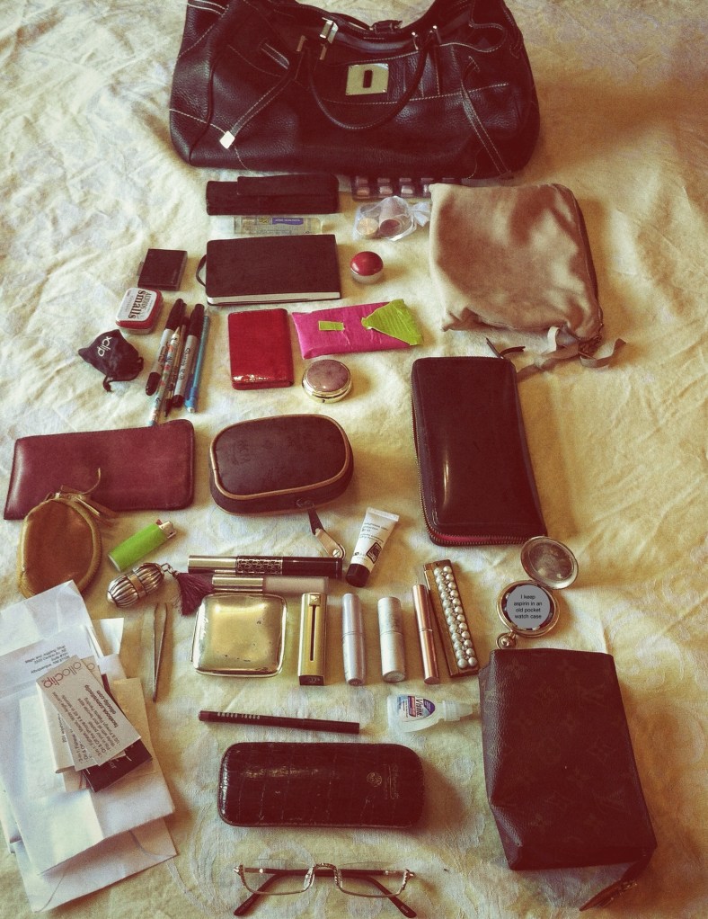 Years ago I read about an artist by the name of Nathalie Lecroc, a Parisian artist. You make an appointment with Ms. Lecroc, meet her at her apartment and empty the contents of your handbag onto her dining room table. Three hours later, she hands you a watercolor painting of your bag contents. The only rule is that you cannot not edit the contents before you visit Ms. Lecroc….and she can always tell when someone has – usually pharmaceuticals — which I also edited in my photo….seemed like a good idea….