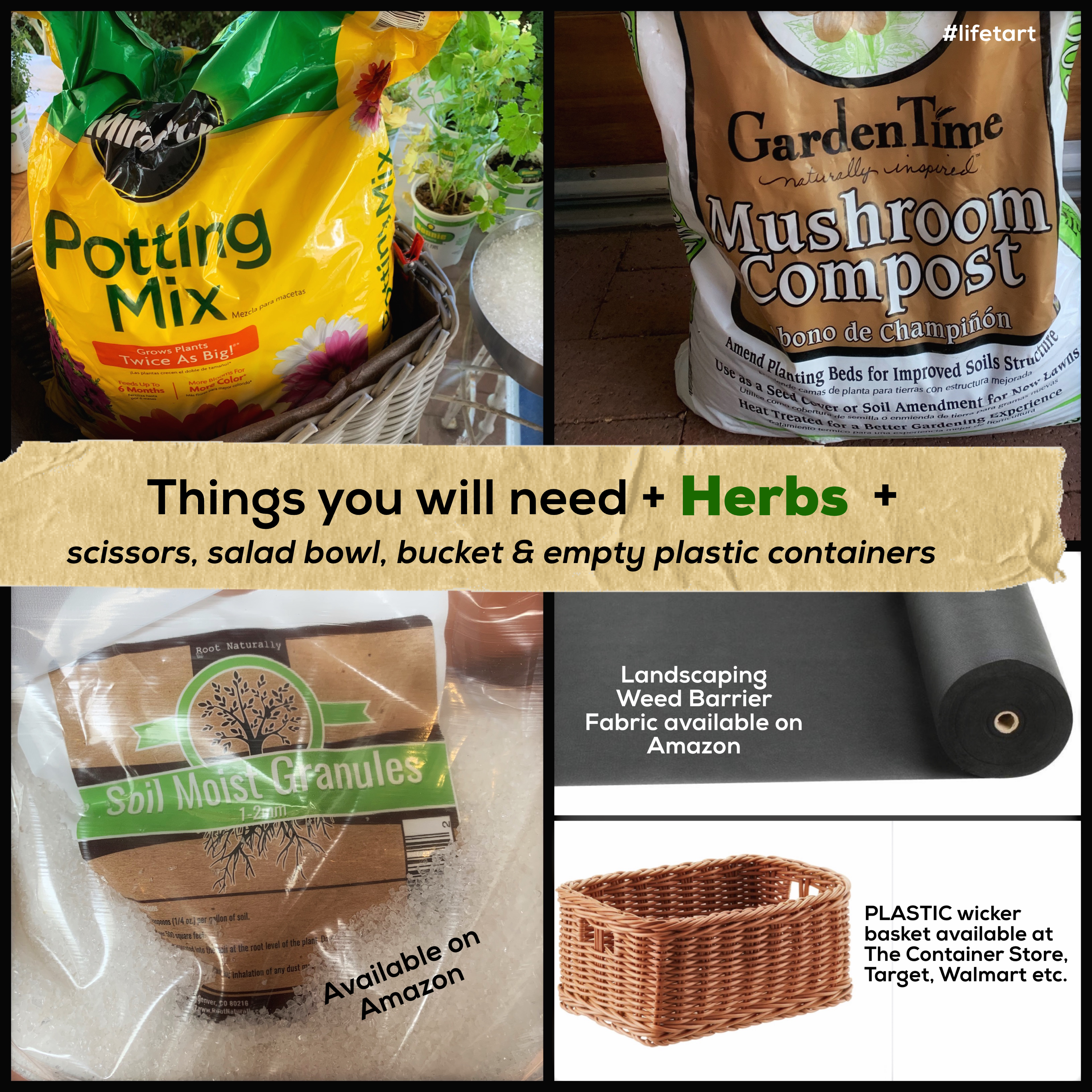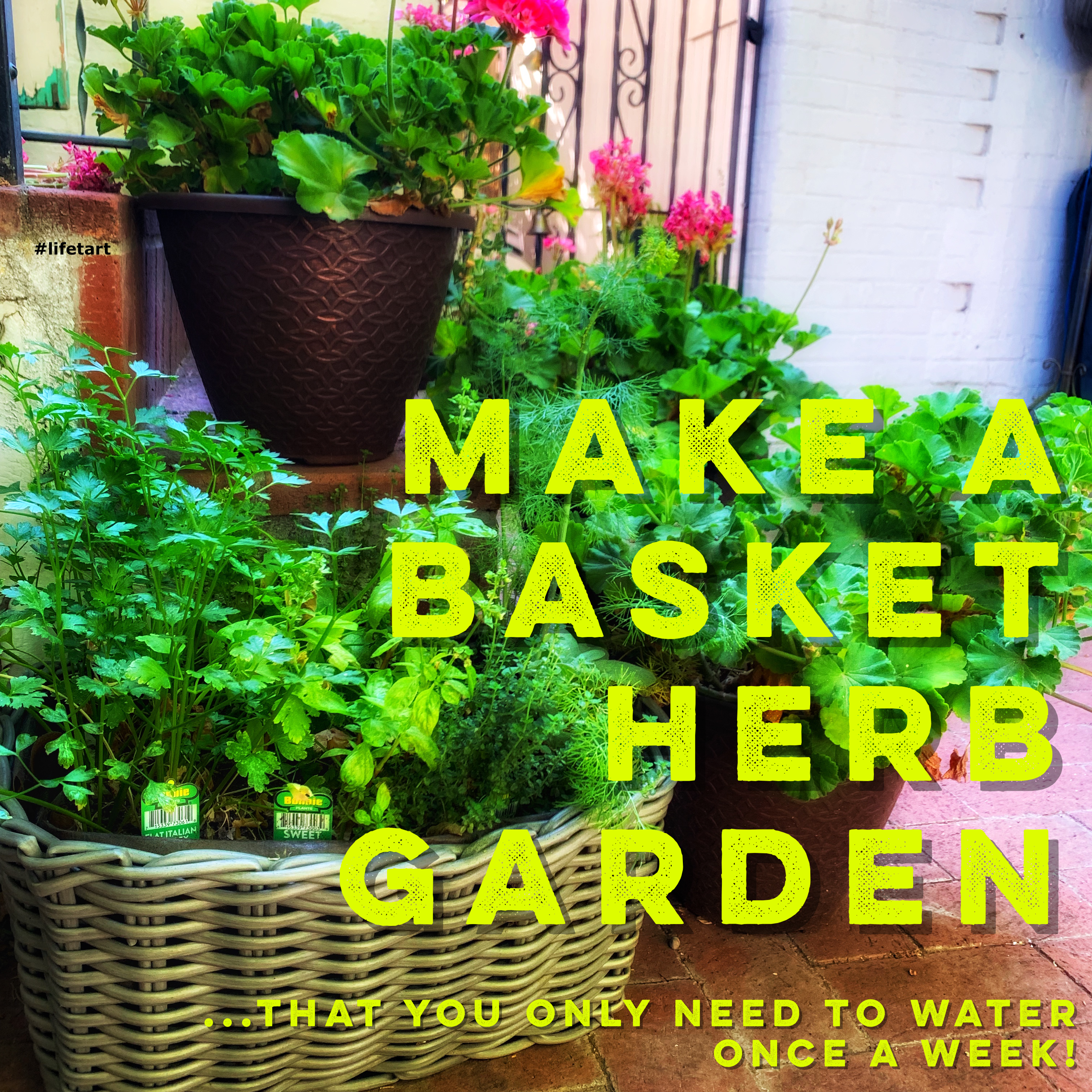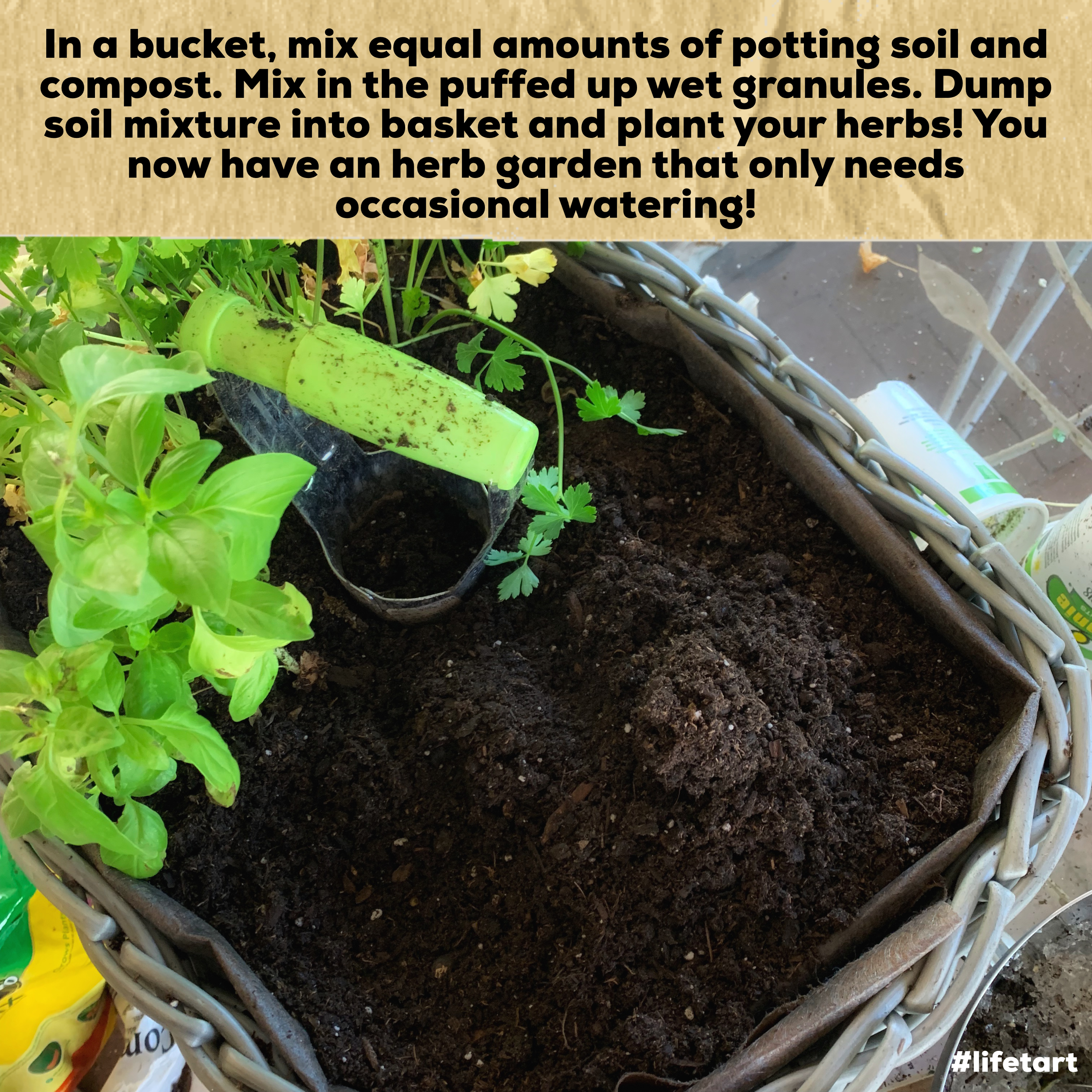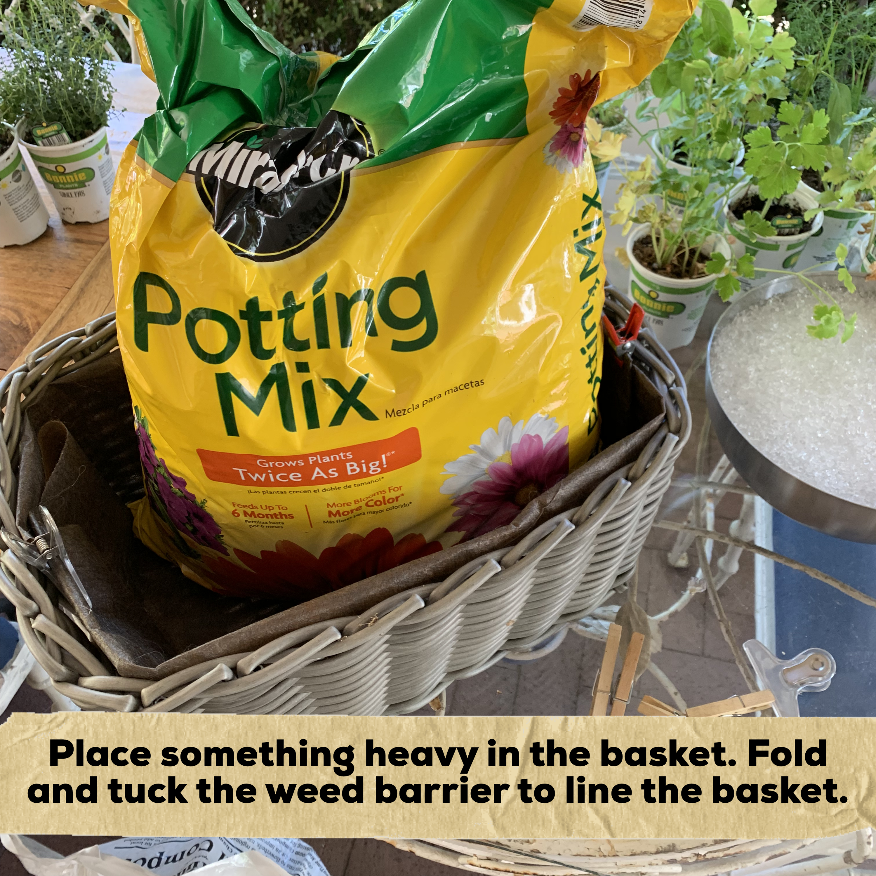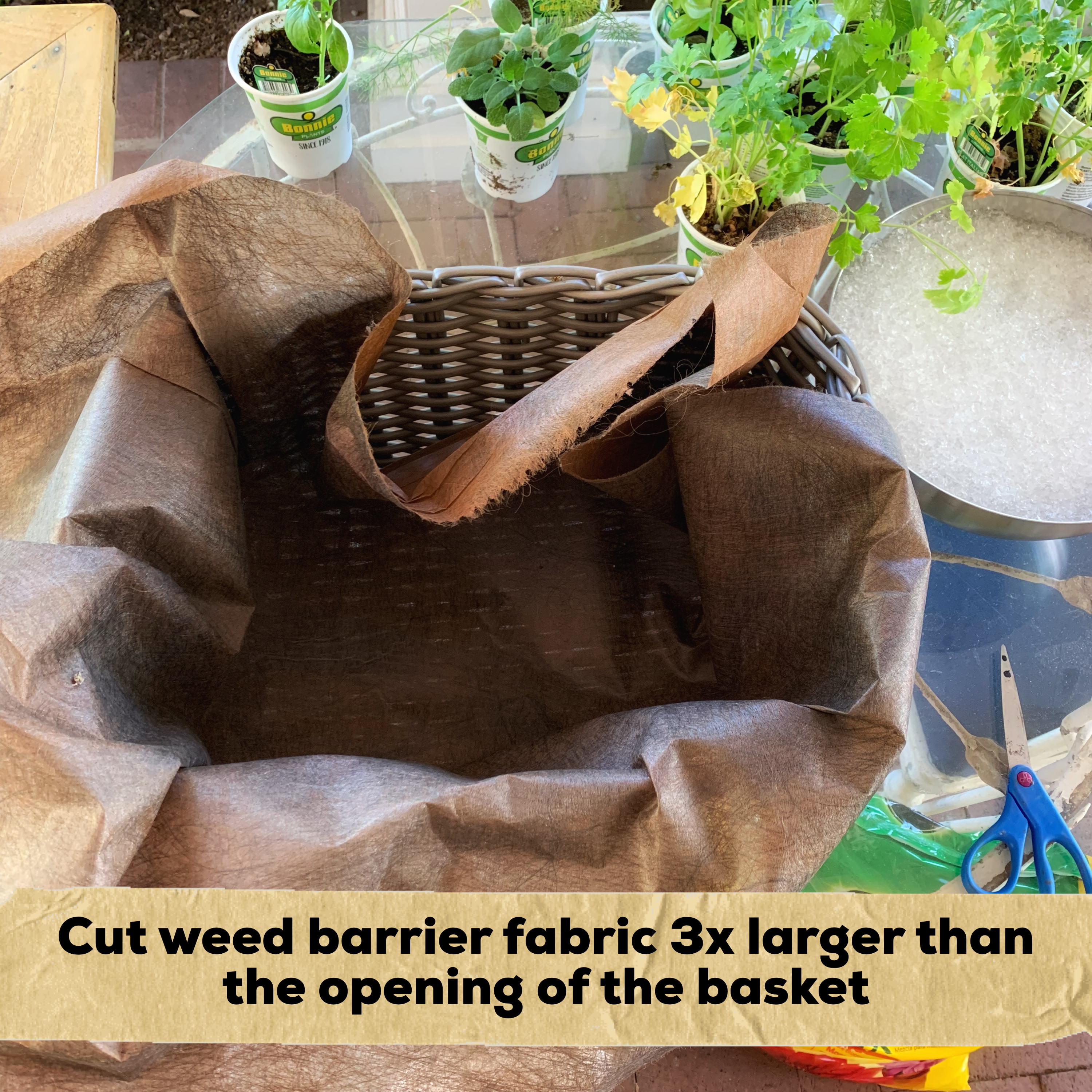 I wanted to keep them by the back kitchen steps because it is more convenient than where I usually grow herbs and I had become attached to the whole “basket” idea, so I set about figuring out how to plant them in the basket without dirt leaching out every time I watered them – AND how to avoid the responsibility of needing watering them frequently (I live in New Mexico and our humidity hovers around 10-20% ). I came up with this idea and it has worked beautifully – I much prefer it to my old herb container garden on the drip system! If you try this, just make sure to heavily water the basket once a week – the water crystals/granules need a chance to soak up enough water to see the plants through the next 7 days or so!