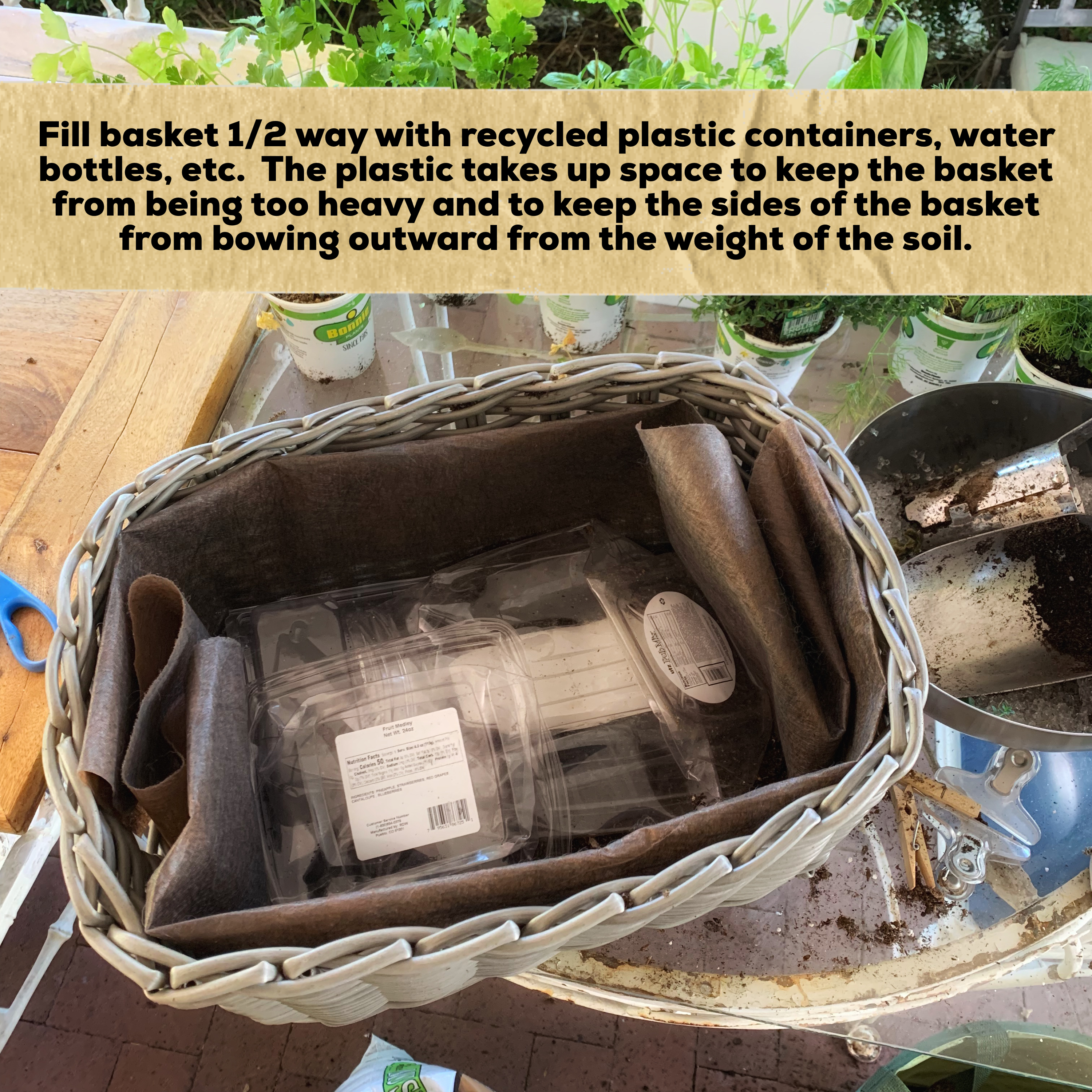 I’m a big fan of using plastic baskets as car trash cans (try it and you’ll never go back to using a bag!). As I was unloading plants from the back of my car I used the empty trash basket to carry 6 pots of herbs to the patio. Setting them on the table, I noticed that they looked kind of cute in the basket and wondered if I could just use the basket as an herb garden – I figured “it’s plastic – why wouldn’t it work?”. I left the herbs in the basket and put them by my back step and watered them every day. I wondered if they would continue to grow in their little pots… it became evident that they needed to be in more soil than just their little plastic pots… and I was getting really tired of watering them every day!