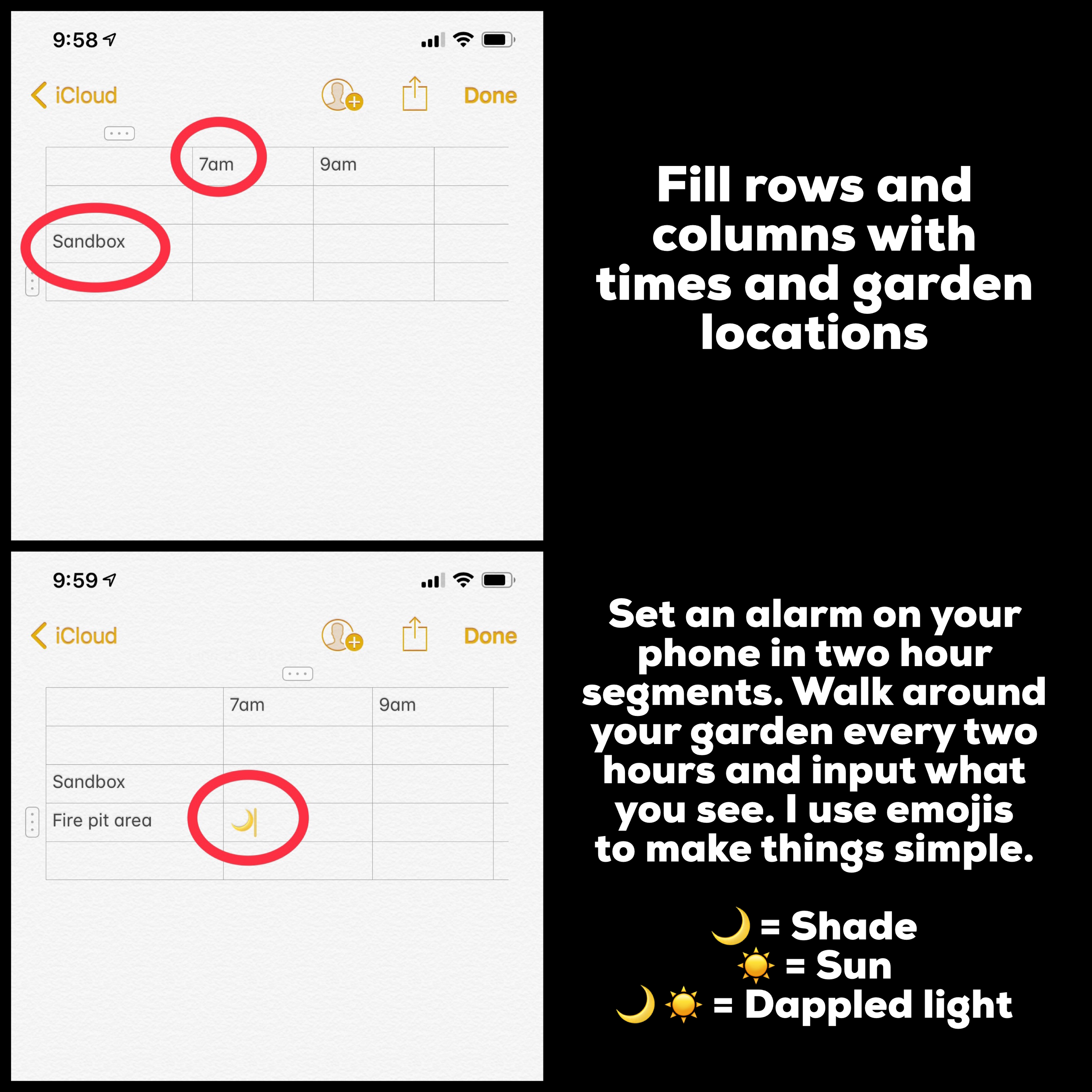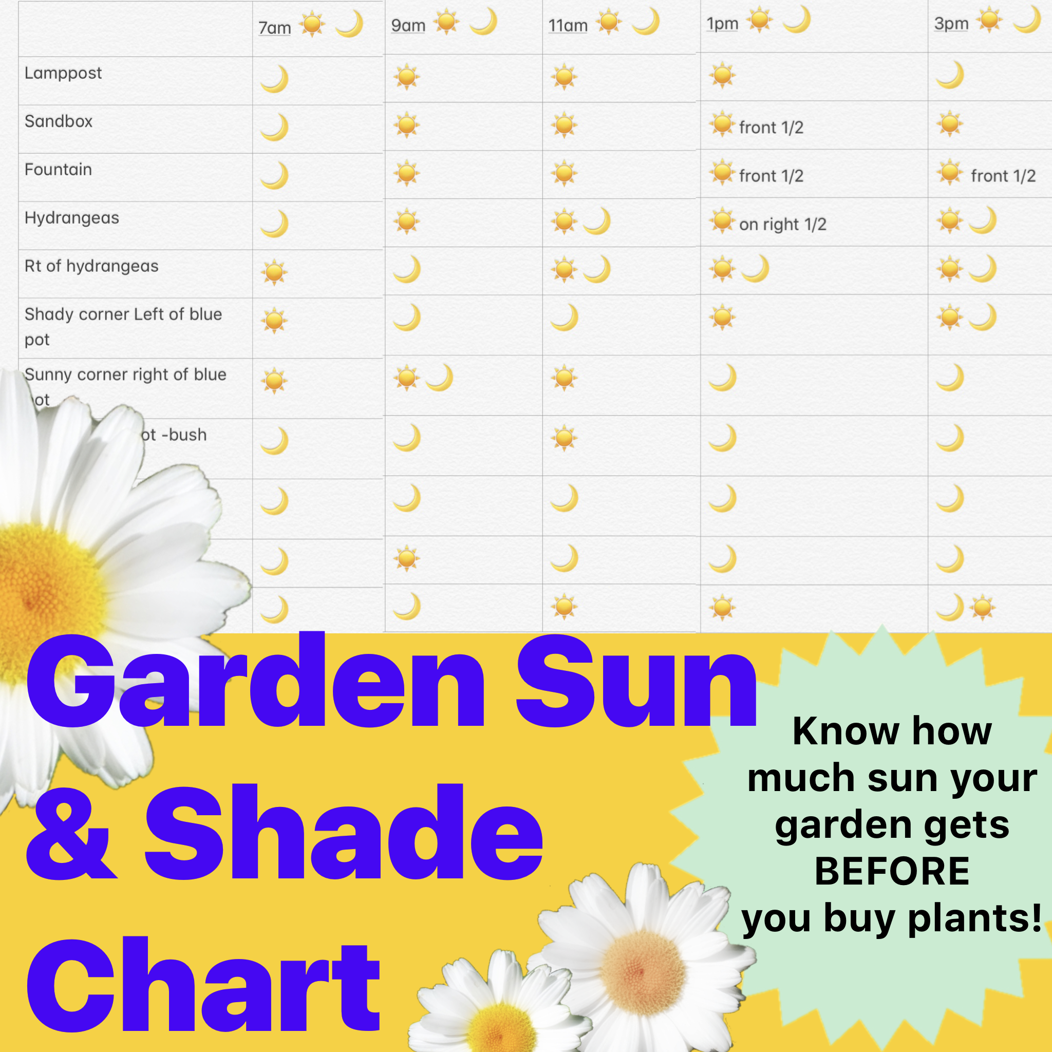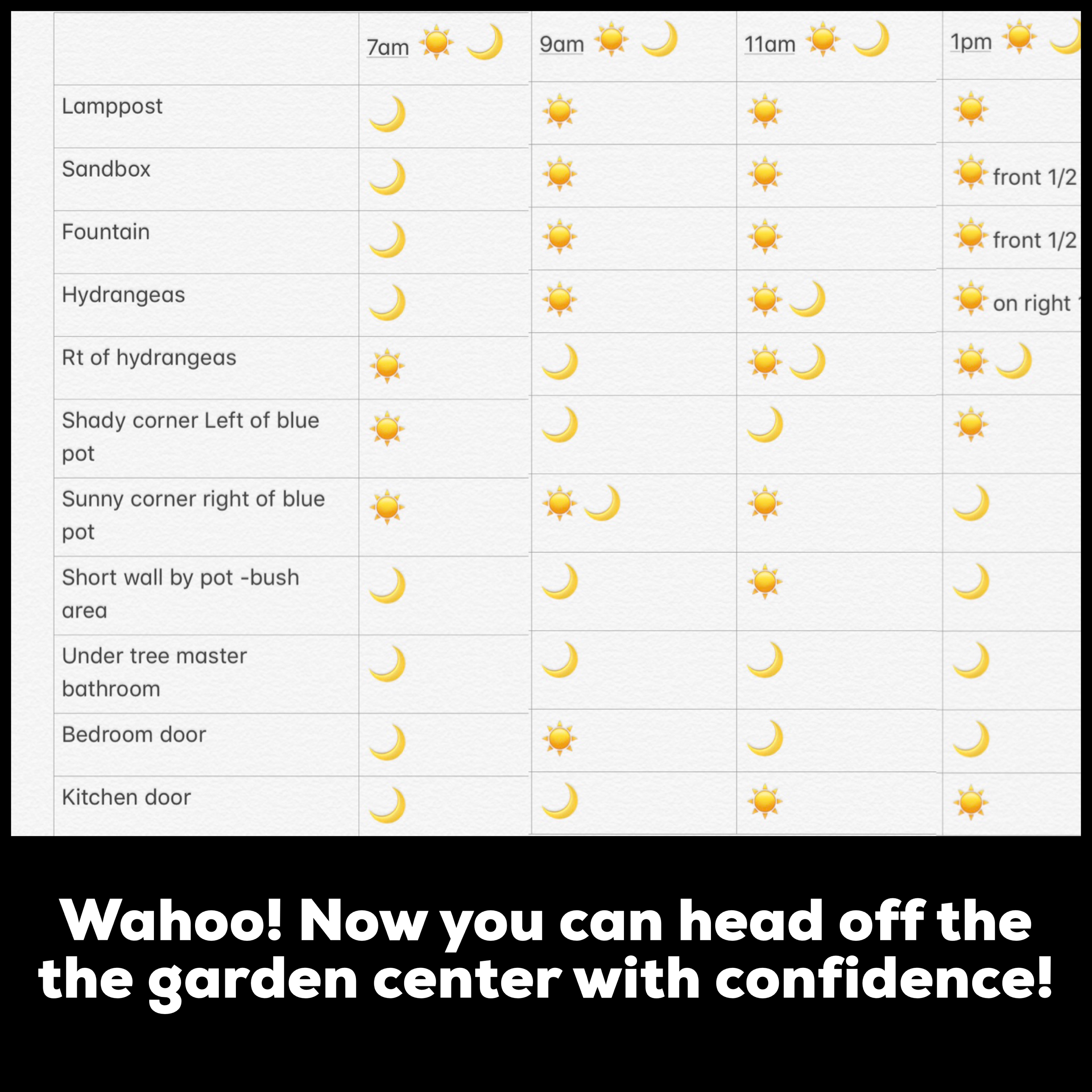 In the past I have taken a shotgun approach to gardening – I would just walk into garden center, pick what I liked, bring it home and plant with abandon with little regard for plant light requirements – not good – it turns out that those little plant tags that tell you about light requirements are really important. A couple of years ago, after getting REALLY tired of spending money on plants just to kill them later, I came up with this idea. Now I go to the garden center, check my Sun & Shade chart and buy plants that grow in the conditions of my yard….things are much better now… here’s how to make your own chart on your iPhone!