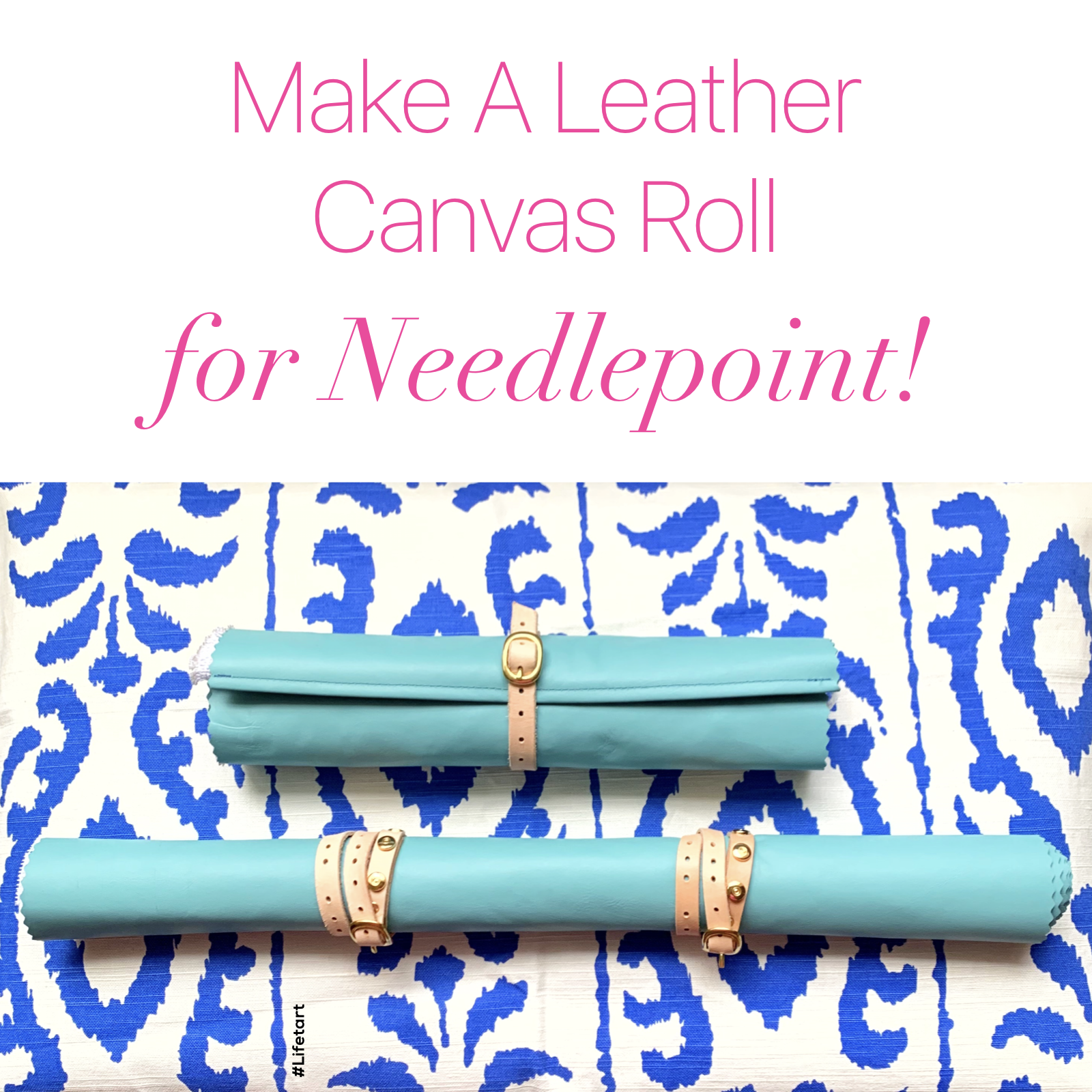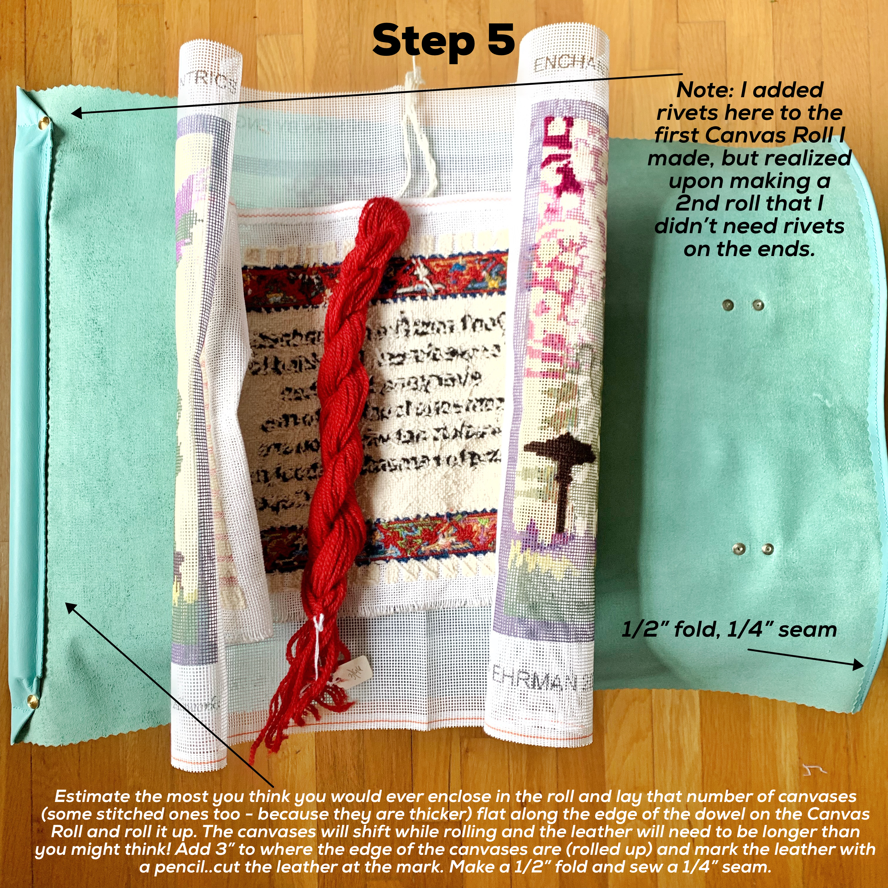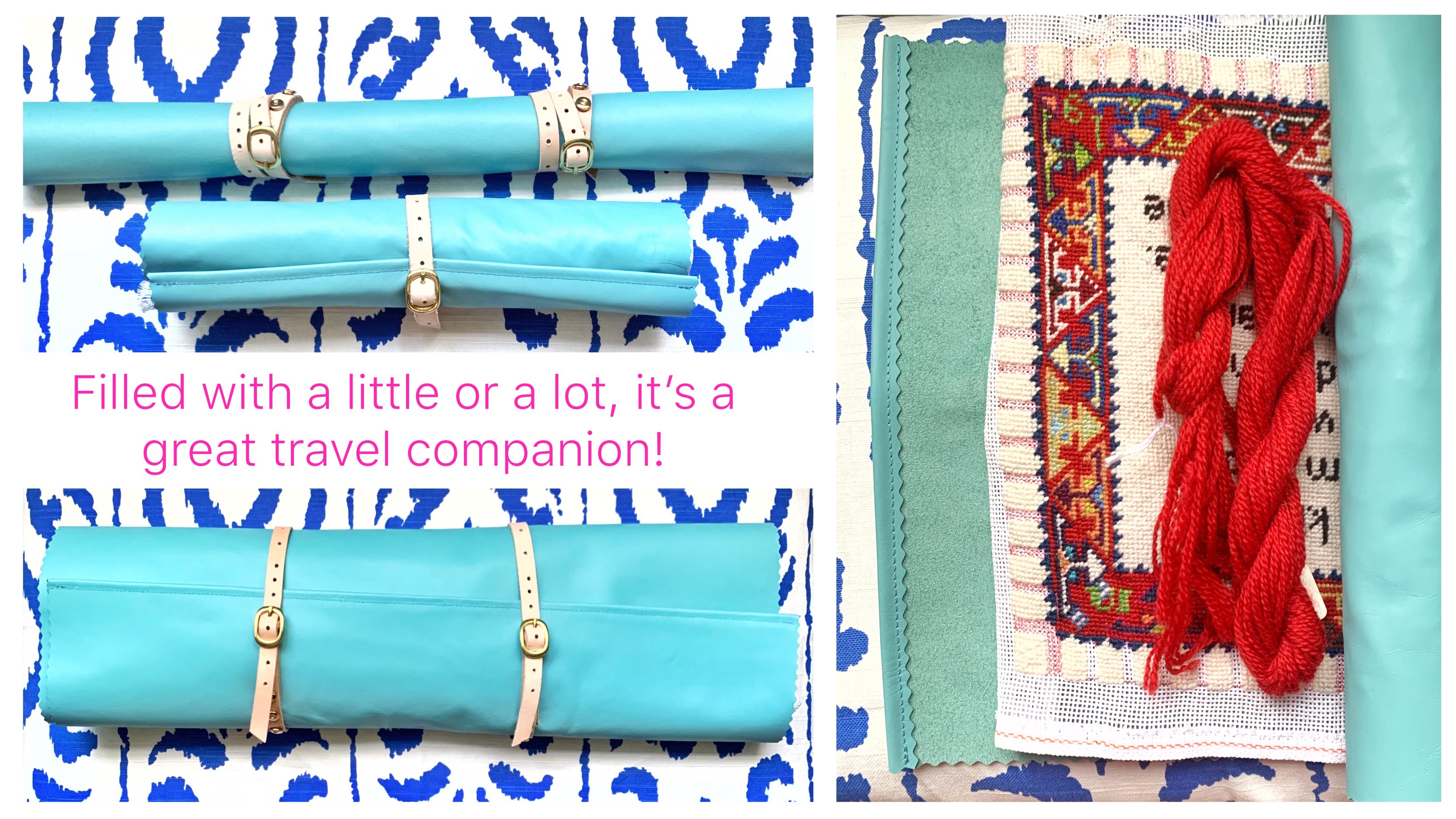 On Instagram in January, Pipandrooneedleworks posted a Needlepoint travel roll that her husband had made for her and I thought “Hey! I want one of those!” …but I can’t stitch leather like that – so I came up with this! If you don’t have a sewing machine I will bet this will still work by just riveting straps onto a thicker piece of leather – as long as it is still pliable enough to roll up!