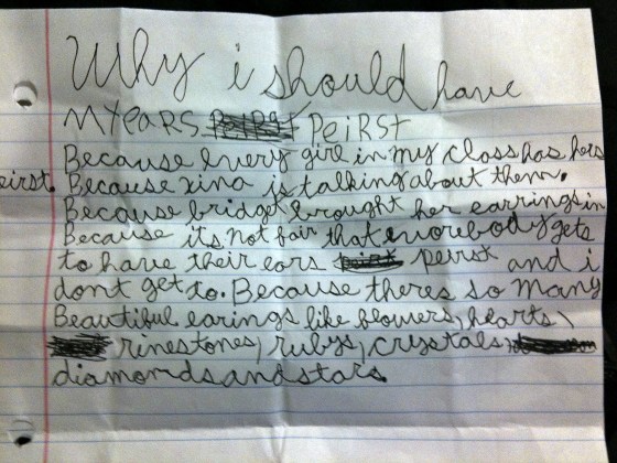 Manifesto of an 8 year old: “Why I Should Have My Ears Peirst”